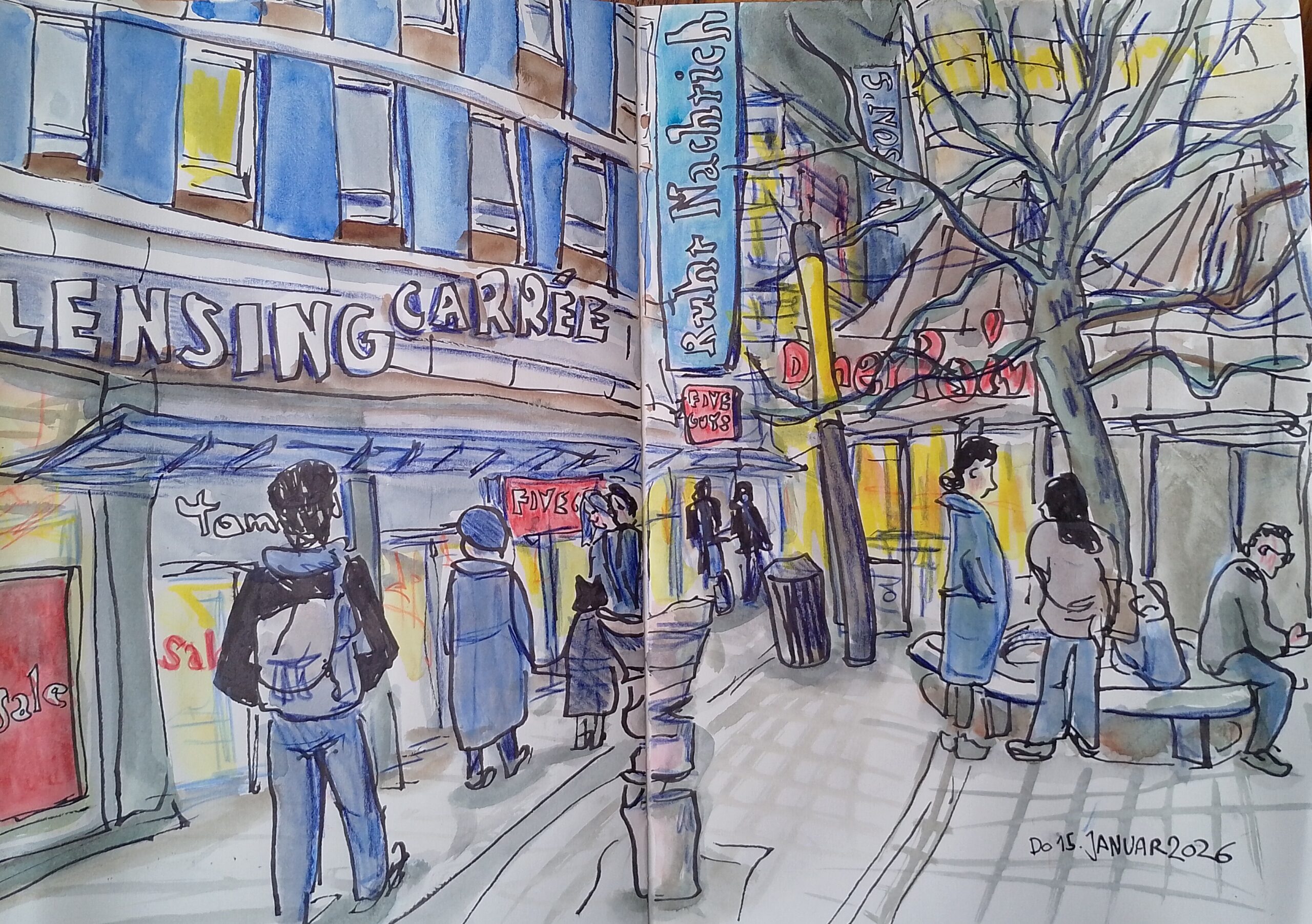 Donnerstags in der Stadt von monika | Jan. 16, 2026 | Dortmund zeichnen | 0 Kommentare Donnerstagstreffen: in und um die “Wintergalerie” im ehemaligen Kaufhof. Blick in die Fußgängerzone bei warmen 8 °C. Kommentar absenden Antwort abbrechenDu musst angemeldet sein, um einen Kommentar abzugeben.